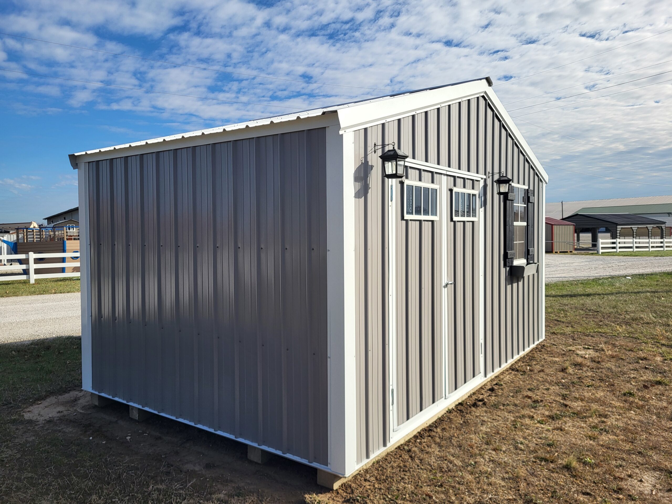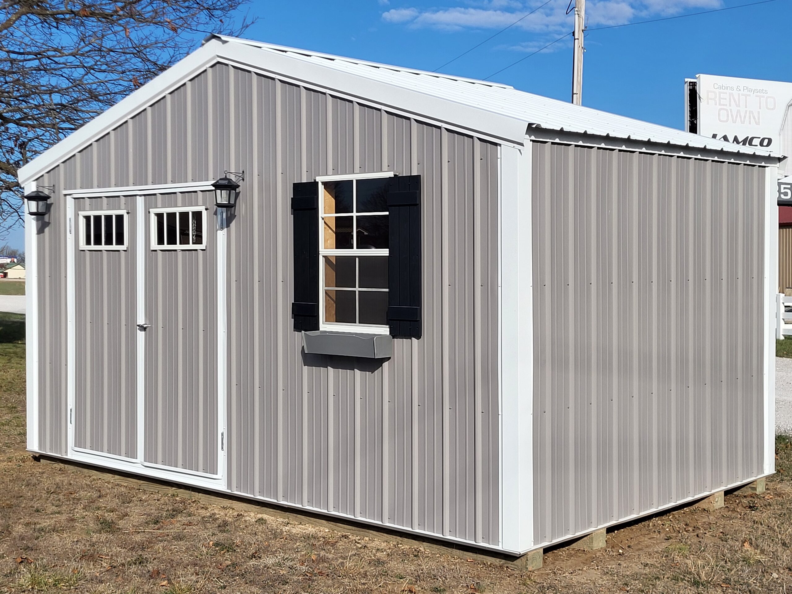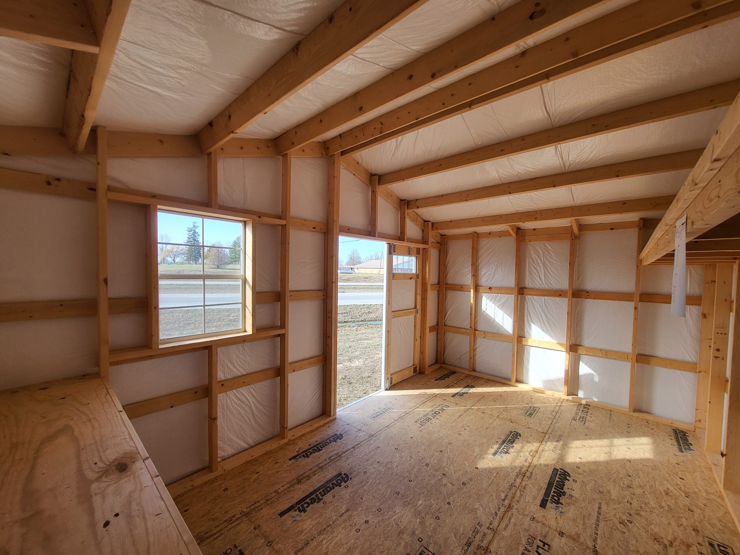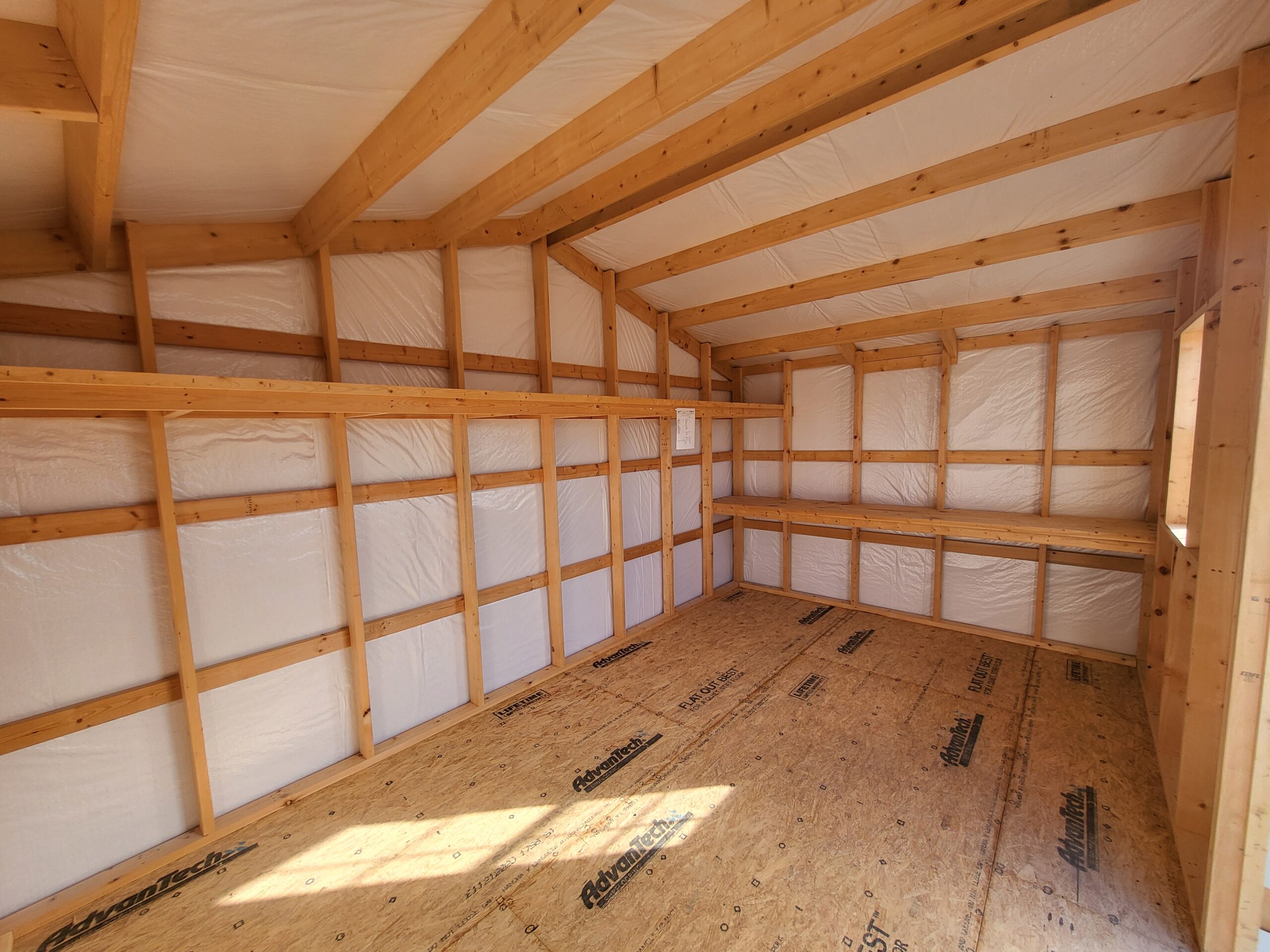 Advantech flooring, Silvercote insulation wrap, 6' double door, 2030 window, 2-transom windows, shutters, windowbox, 10' workbench, 16' high shelf, solar carriage lights