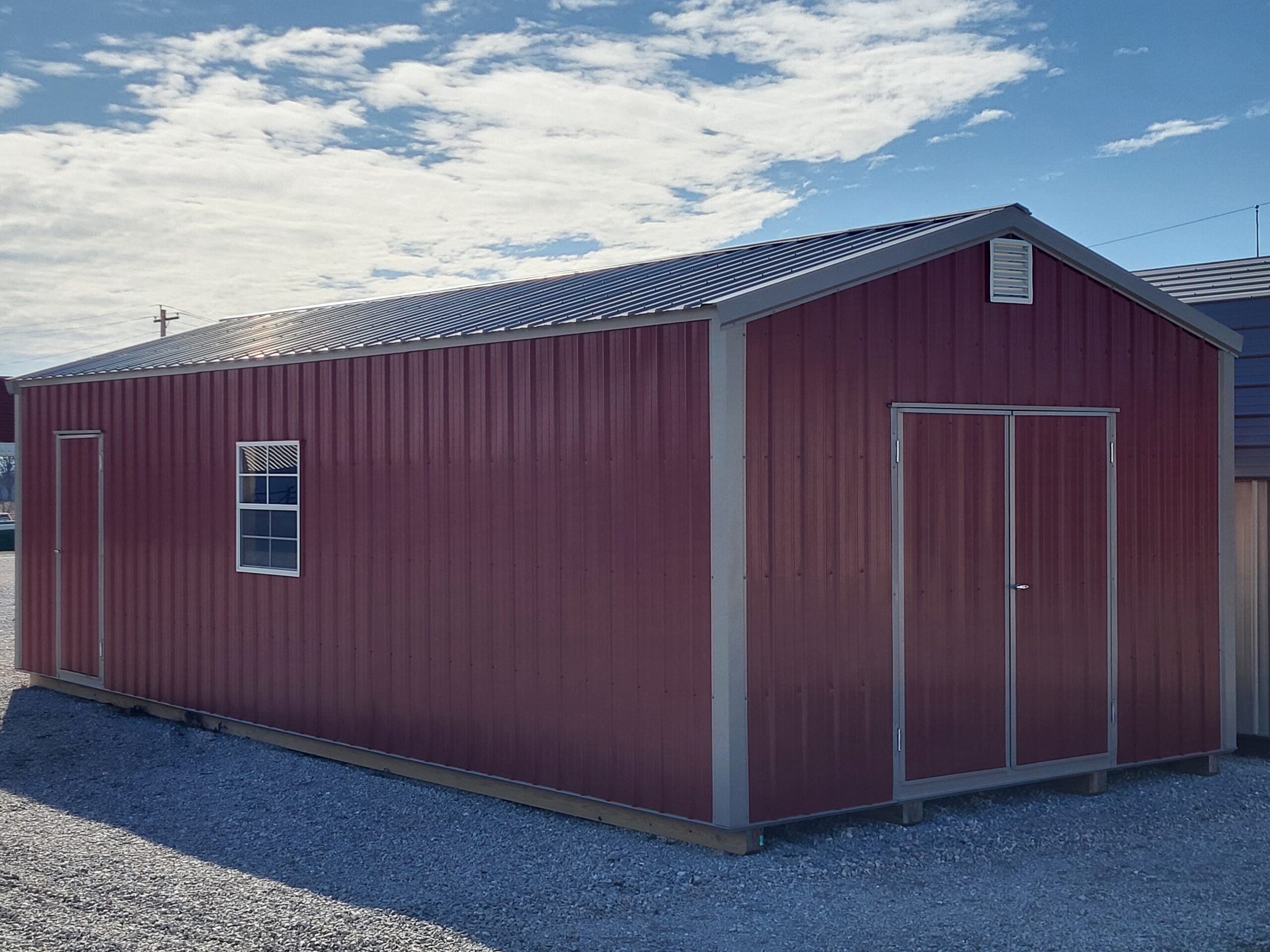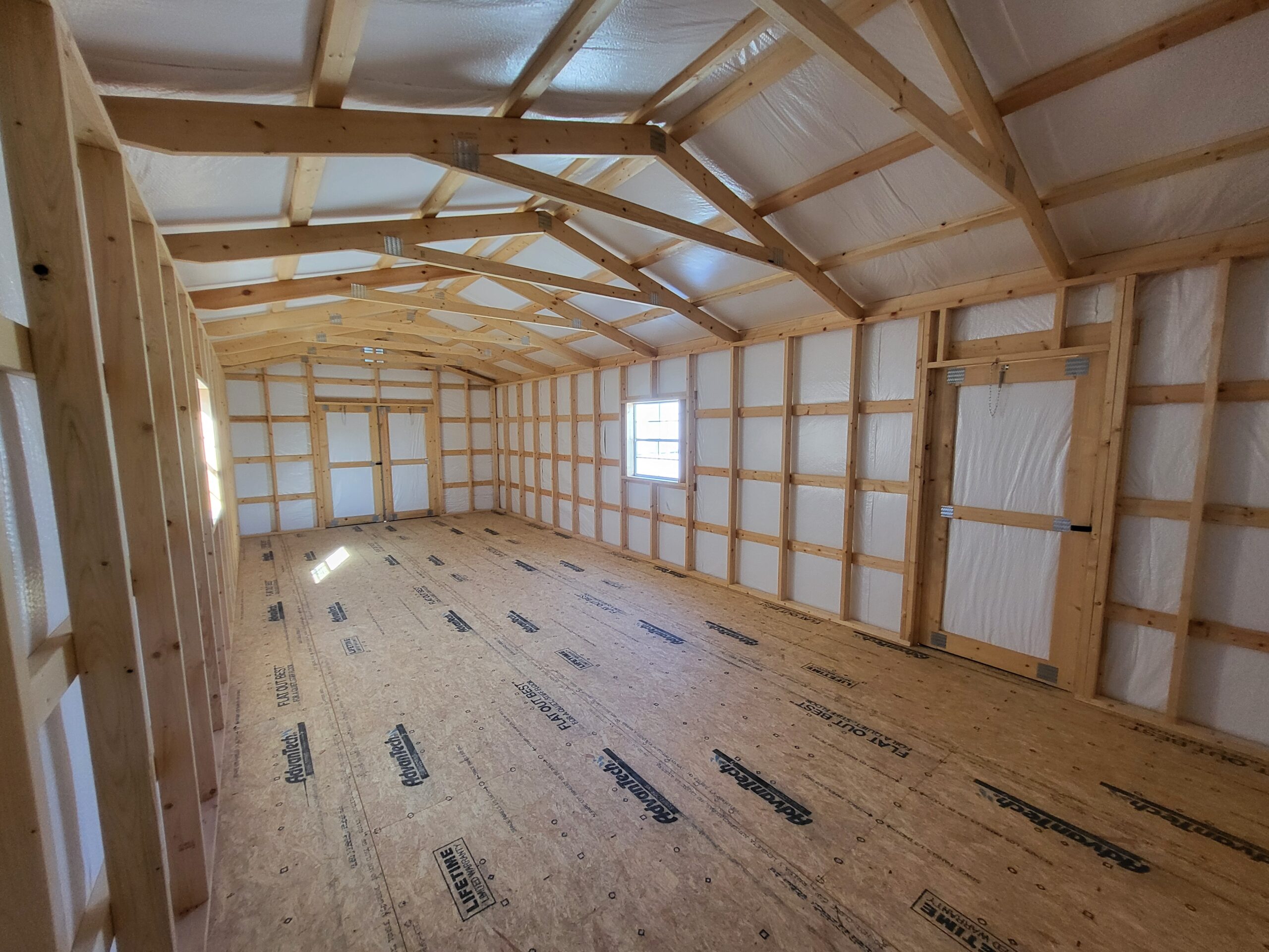 Advantech flooring, Silvercote insulation wrap, 6' double door, 2-3030 windows, 2-vents, 8' wall, 3' shop-built door on side wall