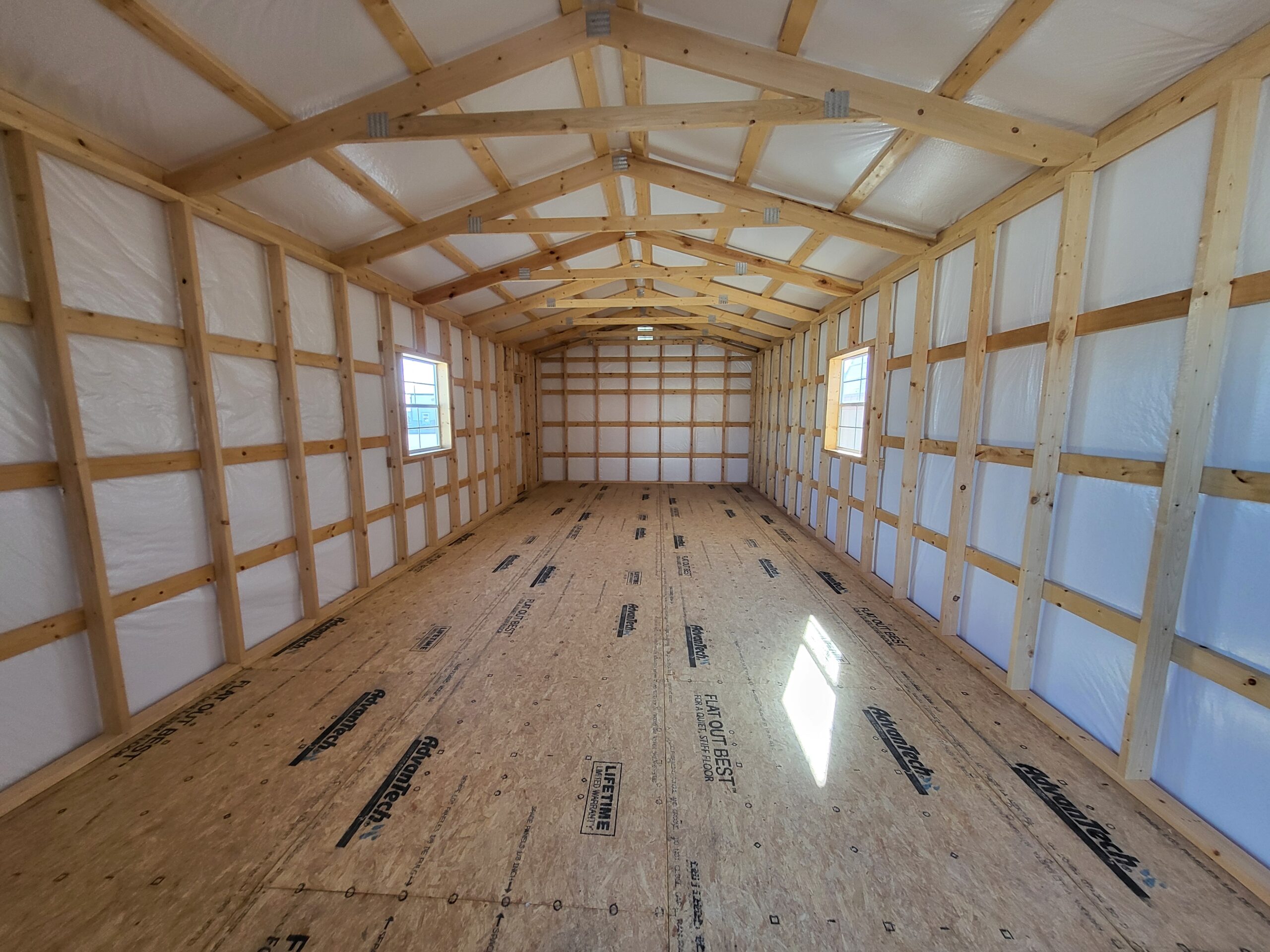 Advantech flooring, Silvercote insulation wrap, 6′ double door, 2-3030 windows, 2-vents, 8′ wall, 3′ shop-built door on side wall