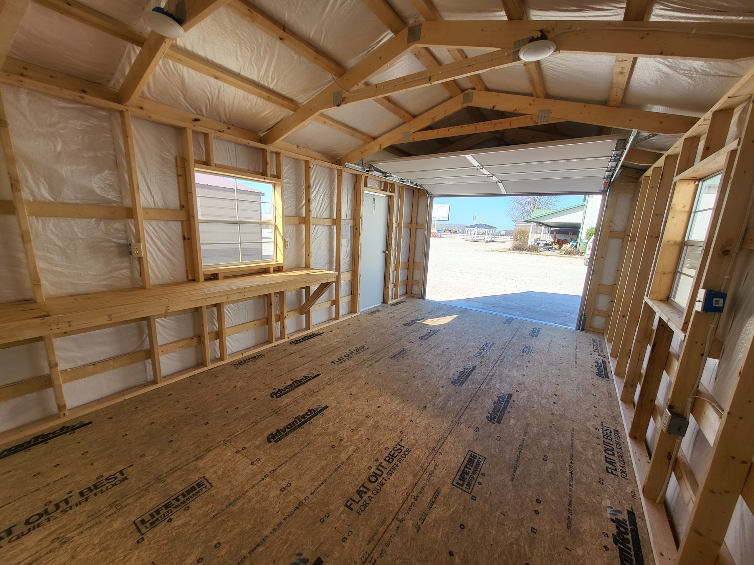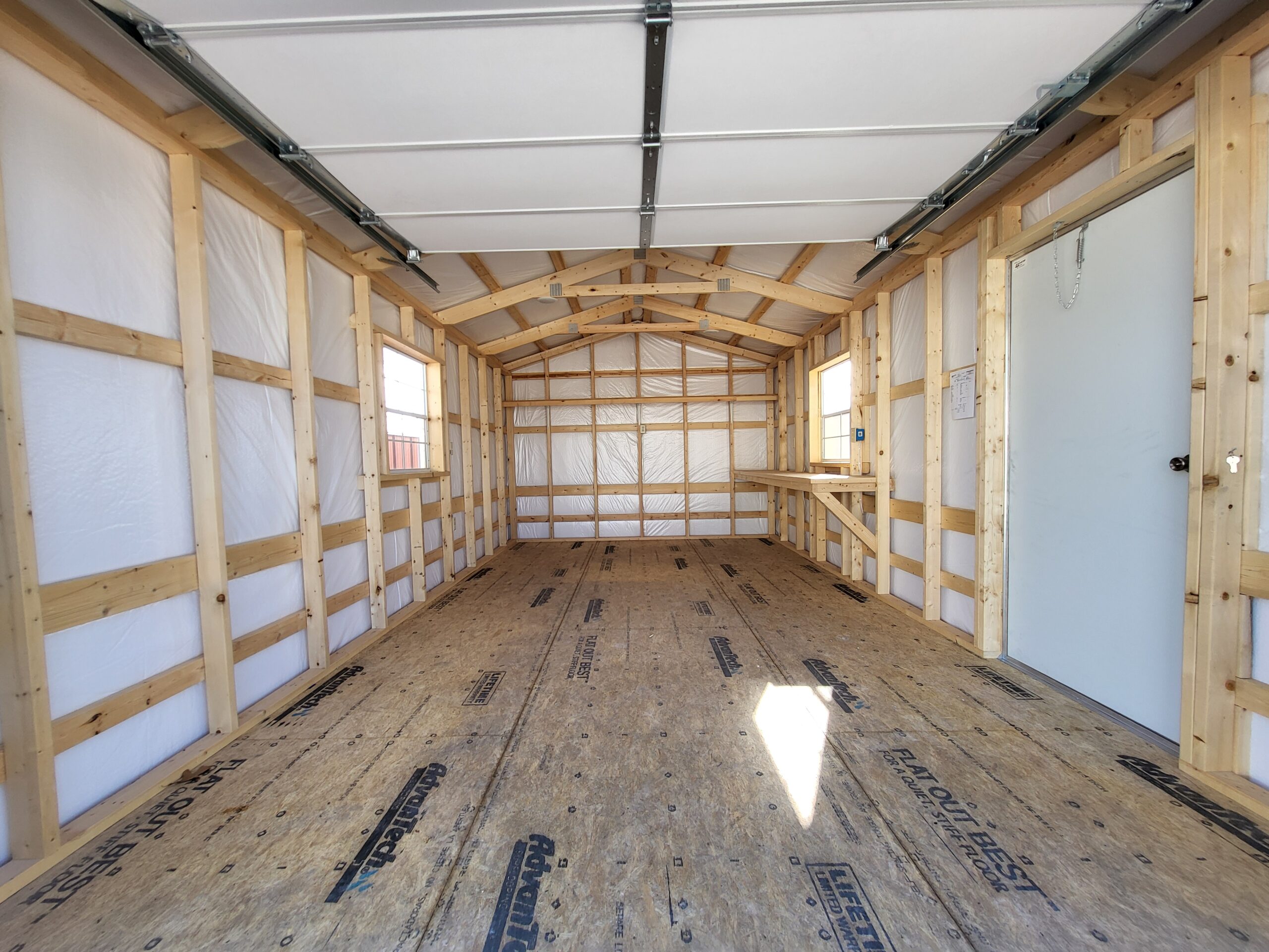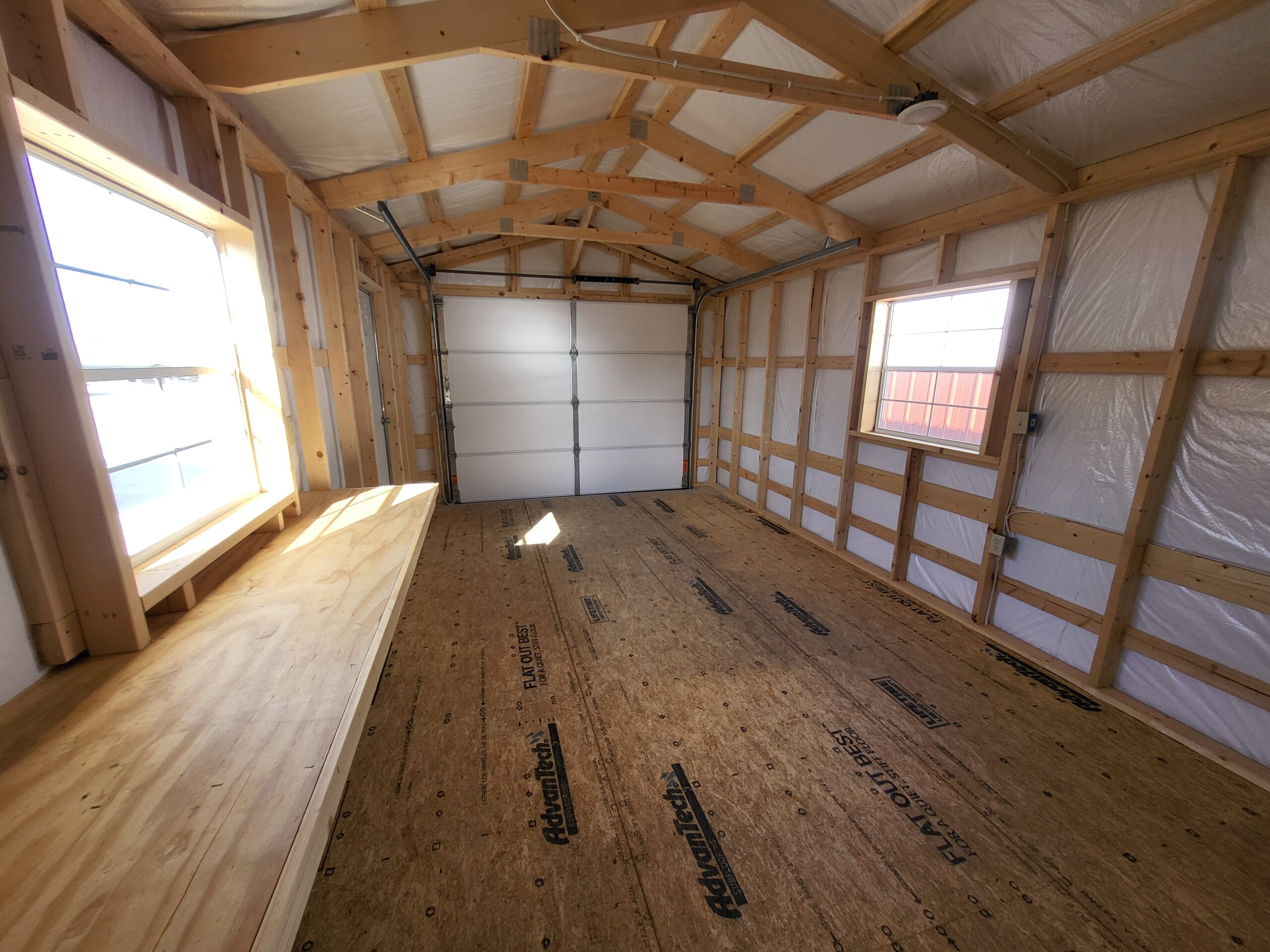 Advantech flooring, Silvercote insulation wrap, 3068 aluminum entry door, 9x7 OH garage door, 2-3030 windows, 8' workbench, 12' shelf, electrical, wainscot